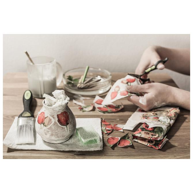 - za dekoriranje salvetama na većini materijala: tkanina, koža, drvo, plastika