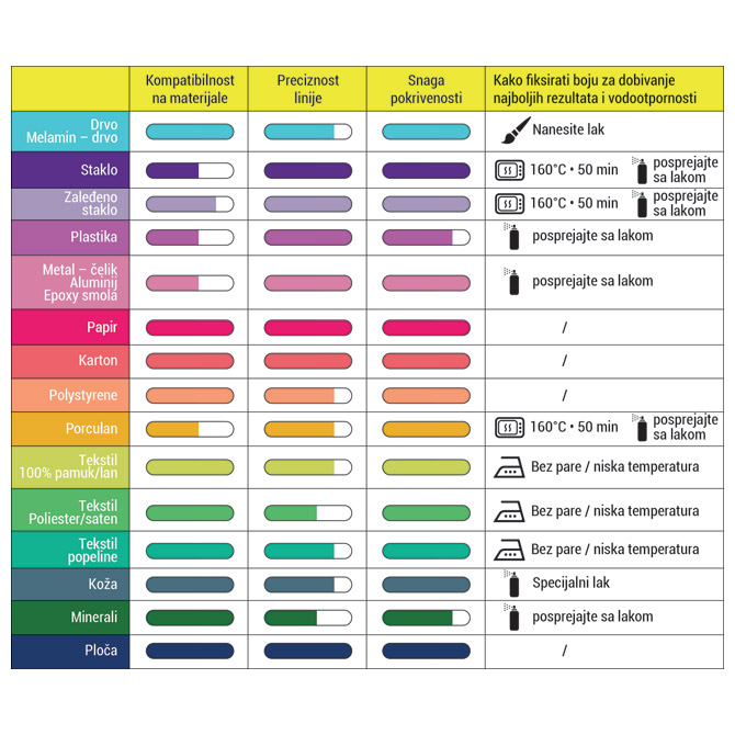 - Za pisanje i dekoriranje na svjetlom i tamnom papiru i primjena na gotovo svim površinama (plastika, metal, tkanina, staklo…)