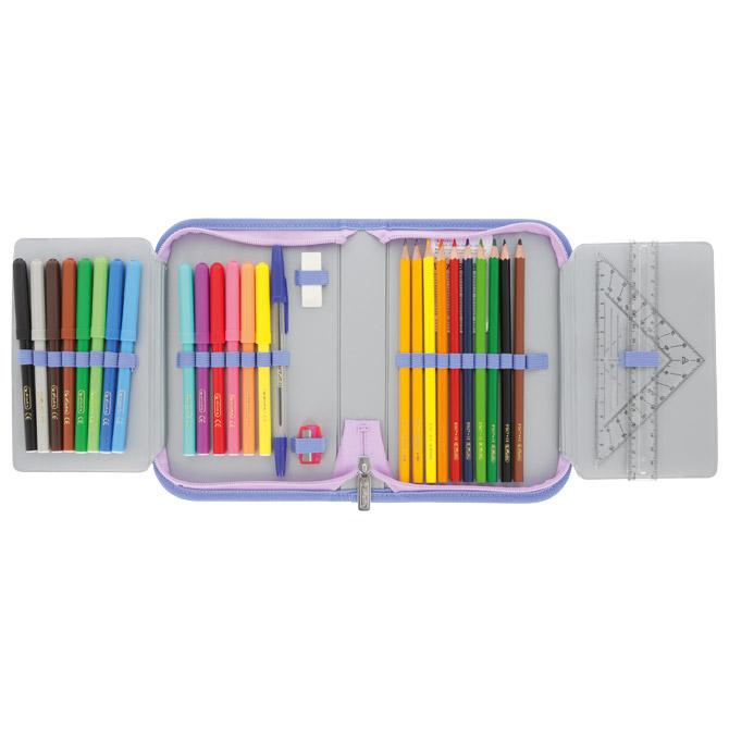 - punjena s 31 komadom pribora: flomaster školski 14 boja, boje drvene 8 boja, olovka grafitna HB x 2 komada, šiljilo, gumica, ravnalo pvc, trokut, olovka kemijska i raspored sati x 2 komada