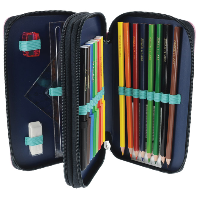 • punjena s 23 komada pribora: flomaster školski 8 boja, boje drvene 8 boja, olovka grafitna HB x 2 komada, šiljilo, gumica, ravnalo pvc, trokut i olovka kemijska