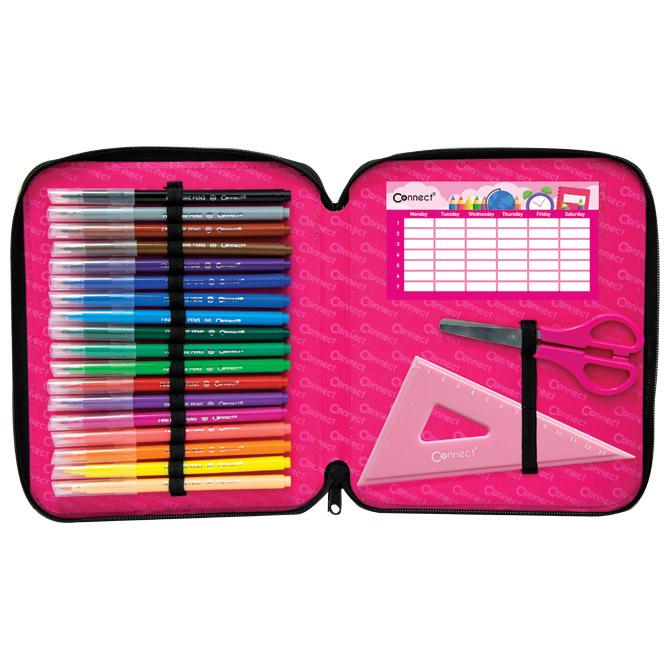 • sadrži 48 komada pribora: flomaster školski 18 boja, boje drvene 18 boja, olovka grafitna HB x 2 komada, šiljilo, gumica, ravnalo pvc, olovka kemijska trobojna, olovka tehnička 0,5 mm, mine 0,5 mm, olovka kemijska, trokut pvc, škare školske i raspored sati obostrani
