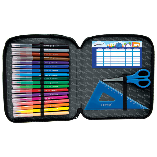 • sadrži 48 komada pribora: flomaster školski 18 boja, boje drvene 18 boja, olovka grafitna HB x 2 komada, šiljilo, gumica, ravnalo pvc, olovka kemijska trobojna, olovka tehnička 0,5 mm, mine 0,5 mm, olovka kemijska, trokut pvc, škare školske i raspored sati obostrani