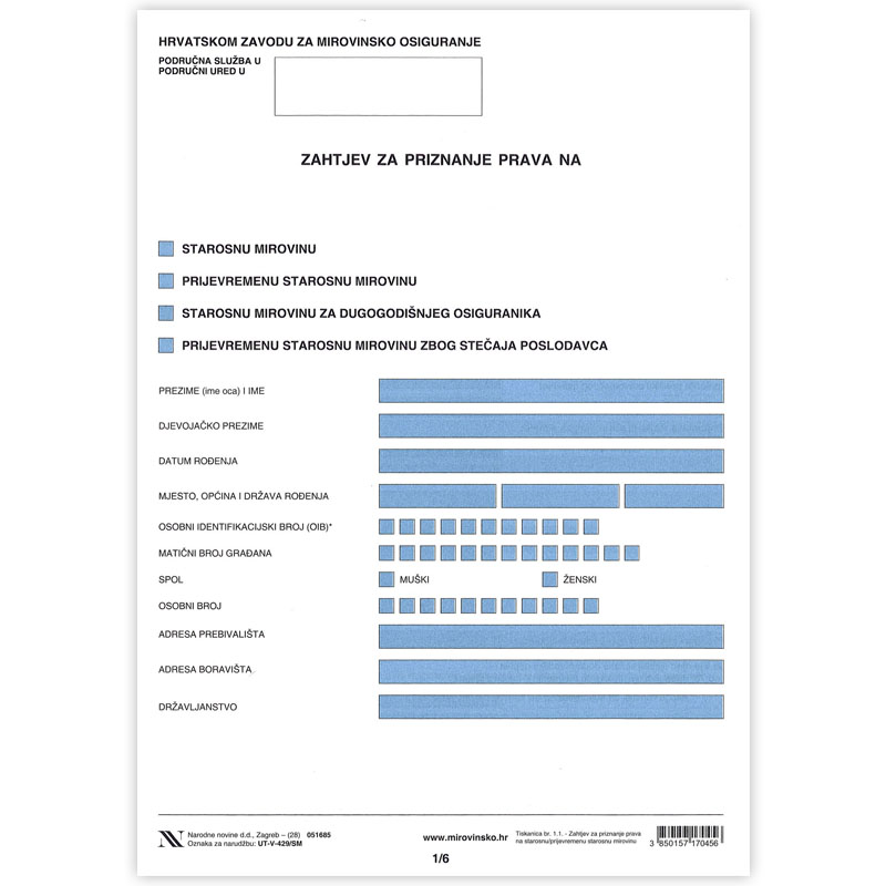 - Zahtjev za priznavanje prava na (starosnu mirovinu, prijevremenu starosnu mirovinu, starosnu mirovinu za dugogodišnjeg osiguranika, prijevremenu starosnu mirovinu zbog stečaja poslodavca)